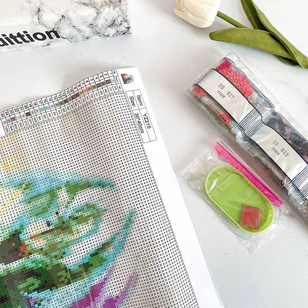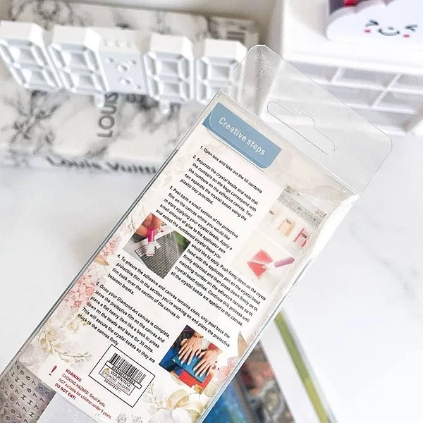 یه صفحه چسبناک که نگین ها با رنگایی که دارن کد گذاری شده کنار هر پک ظرف مخصوص نگین و قلم مخصوص همراه موم هست برای افزایش توجه و تمرکز عالیه سایز 30*40 سانت