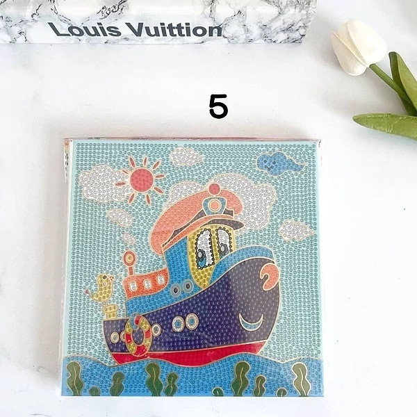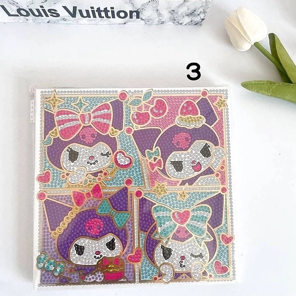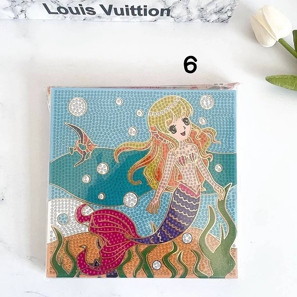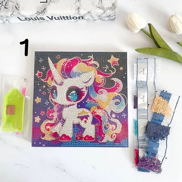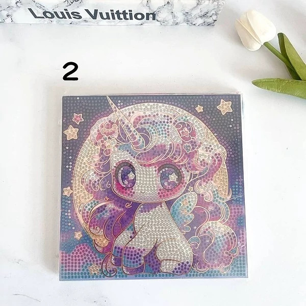 کنار نقاشی نگین های رنگی همراه ظرف مخصوص نگین و قلم و مون گذاشته شده سایز 20.20سانت